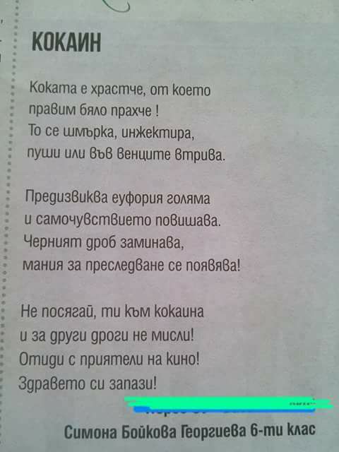 Кокаин Публикувано отbadsatiric05/04/2020Публикувано наКрадена поезияЕтикети:кокаин, поезия от Симона Бойкова Георгиева. Евала на младите! Споделяне: Share on X(Отваря се в нов прозорец) X Share on Facebook(Отваря се в нов прозорец) Facebook Харесвам Зареждане... Related